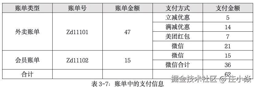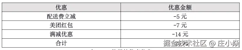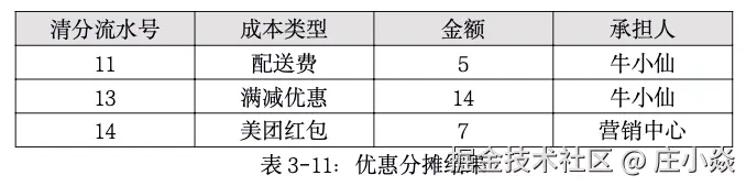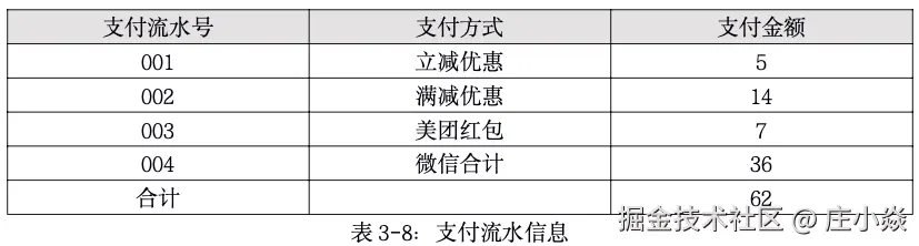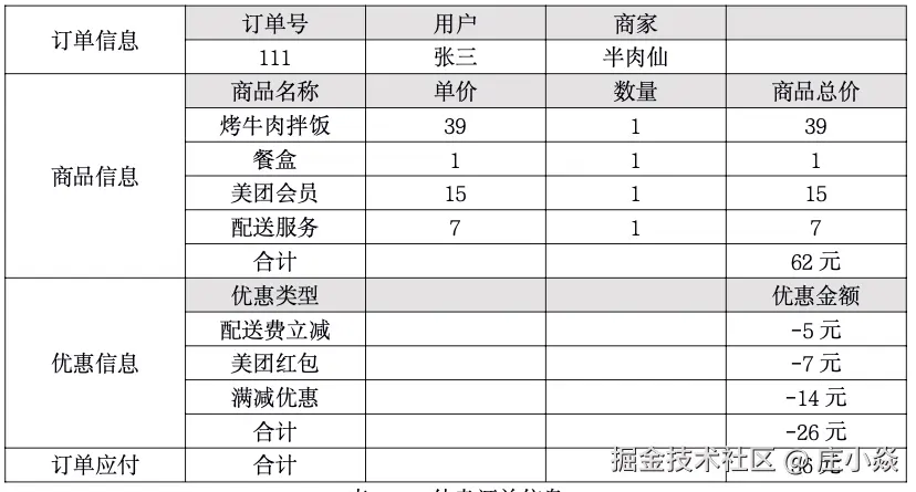 因为目前还不清楚美团和商家之间的清结算协议,所以暂且认为所有优惠由美团提供给用户,后续美团再基于协议跟商家之间做优惠的分摊,这部分不是本节的重点,大家可以私下思考,这样我们就得到了订单信息了,如表所:
