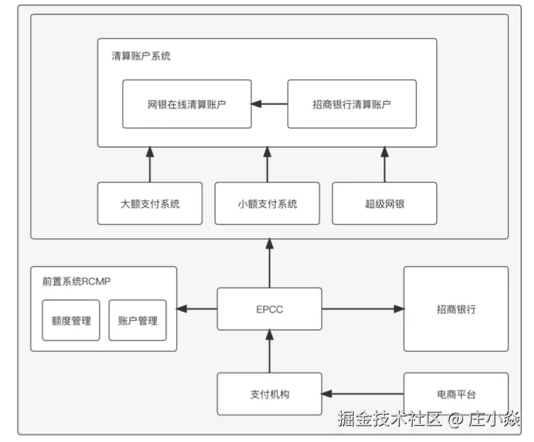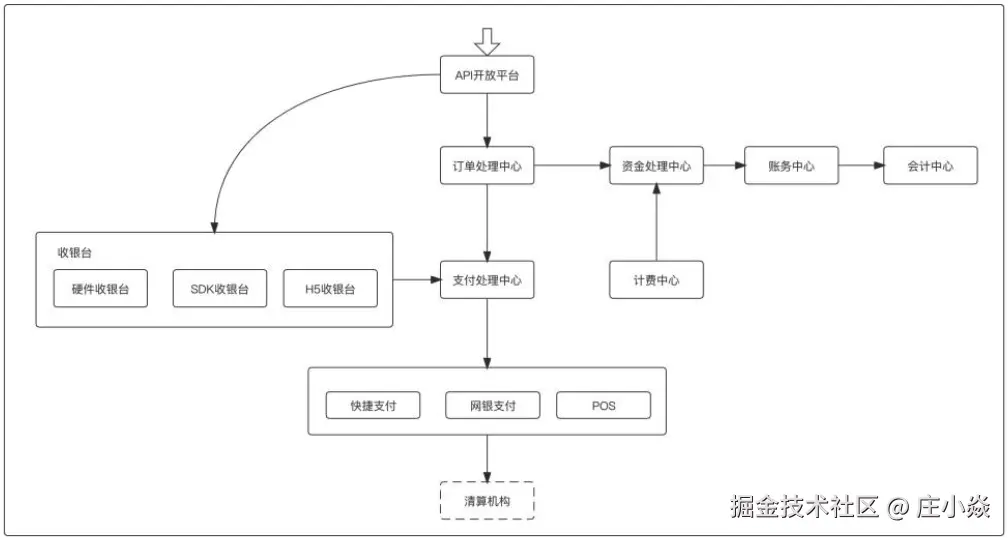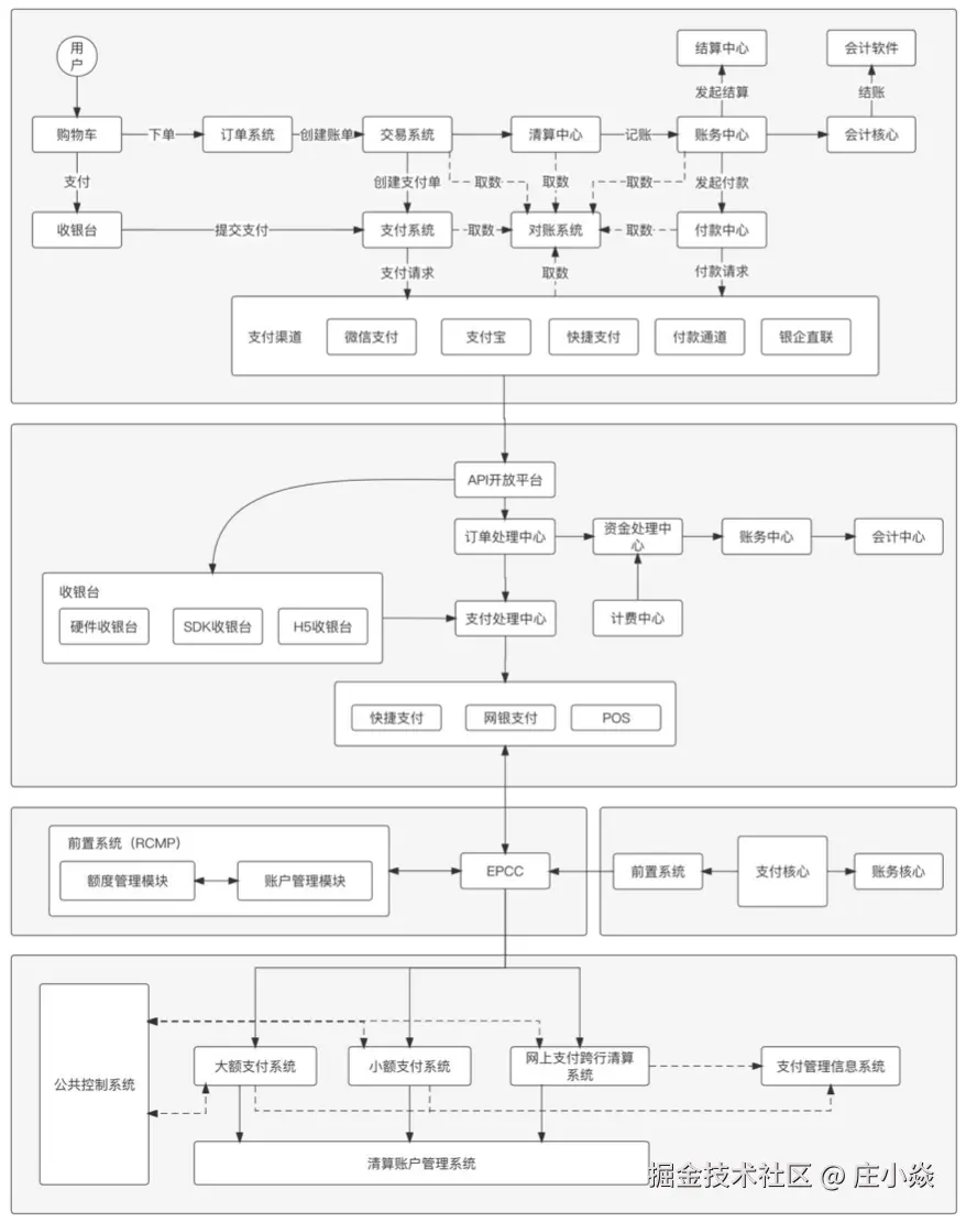 我们将支付部分和清结算部分的架构合并到一起以后,就可以得到一个支付机构典型支付架构,如图所示: