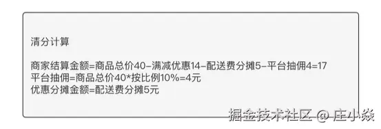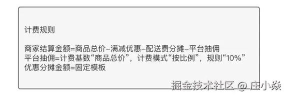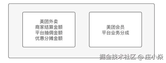 假设计费模型是这样的,美团外卖业务需要计算商家应结算金额,抽佣金额,优惠分摊金额;美团会员计费模型需要计算出美团会员费给平台业务的分成,如图: