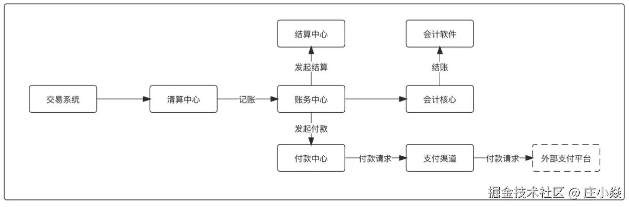 另外,支付成功后还有一条线清结算线,支付成功以后交易将数据提交清算中心完成数据的清分计算,然后提交账务系统完成记账;再通知会计核心完成内部账的记录;最后对商家进行结算付款,如图所示: