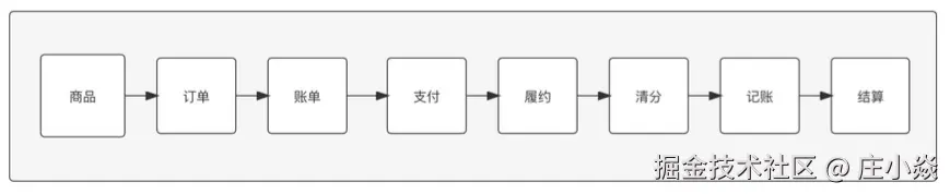 粗略的假想一下,这个过程是怎么完成的,用户先到美团平台选择喜欢的“商品”,然后“下单”,生成交易“账单”,用户选择支付方式进行“支付”,支付成功后美团要履行承诺把餐送到,“履约”完成以后美团就开始进行各方利益的“清分”,计算了算清楚应给给各方多少钱时并计人账簿“记账”,然后就是进行“结算”,这个过程如图3-31所示: