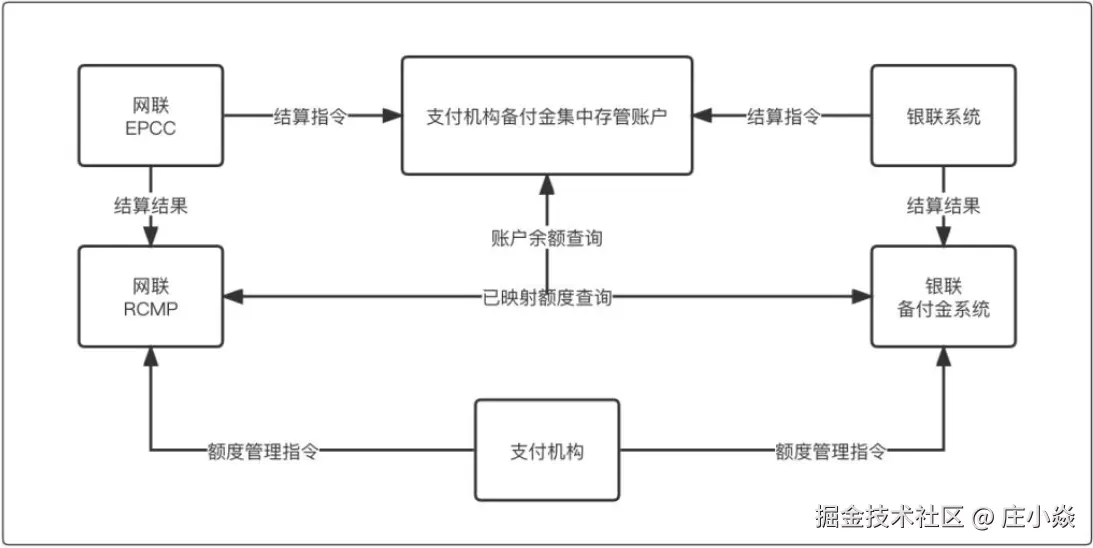 支付机构的指令到了网联以后,网联进行实时清算,什么意思呢,就是实时的对支付指令进行轧差变更可用余额,简单的说就是支付机构将人行备付金的余额映射分配给网联和银联形成映射虚拟额度,用于交易周期内的实时清算;然后定时提交人行进行资金的划拨结算,这个框架如图所示:
