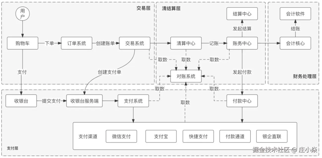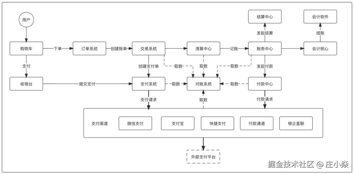 我们看上面的架构图,对于一个服务平台的支付架构,一般有图中的相关系统组成:直面用户的收银台,记录业务的订单系统,推动交易的交易系统,对支付指令进行处理的支付系统,支付指令传送通道的支付通道子系统。