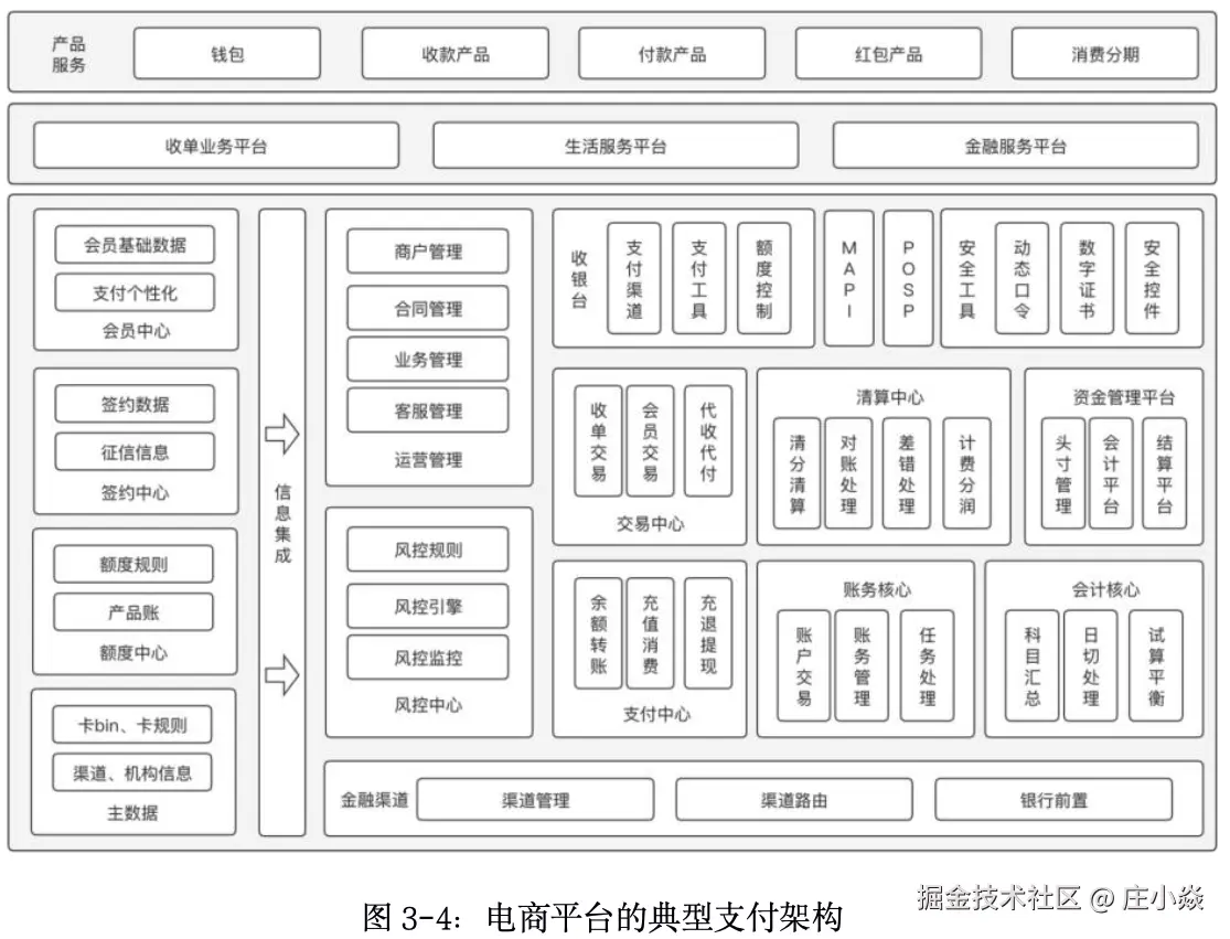 刚才我们说从电商平台买了一本书,那么一个典型的电商平台的支付架构是怎么样的呢!一笔支付在这样的平台内部是怎么流转呢?如图是一个比较典型的电商平台的支付架构: