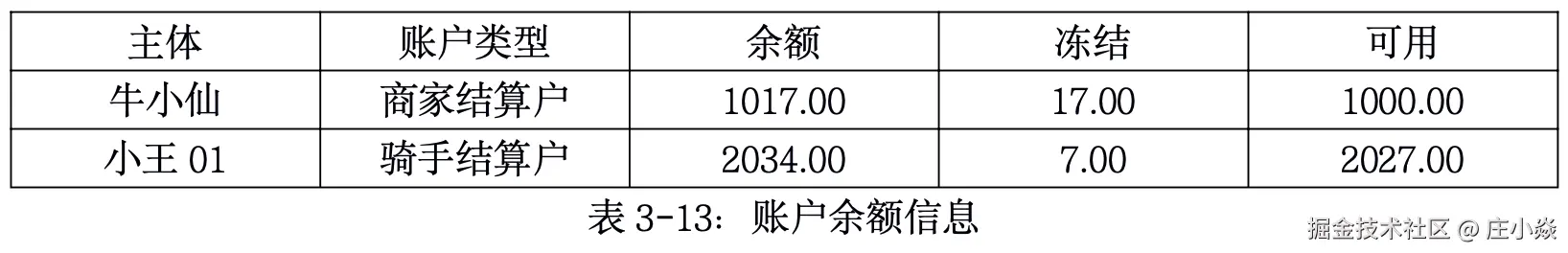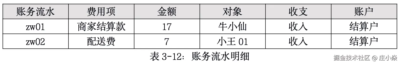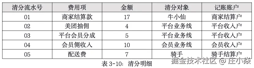 完成清分计费以后就需要请求账务系统完成记账,为了简单这里只对商家的结算和骑手的结算进行记账;这时先生成账务记录,如表3-12所示: