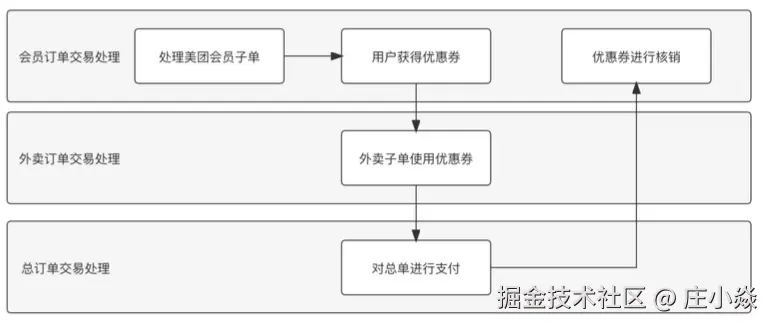 完成了订单以后就需要创建支付账单了,基于以上分析交易处理相对比较复杂,因为要先处理美团会员的购买,然后处理外卖订单,这个过程如图所示: