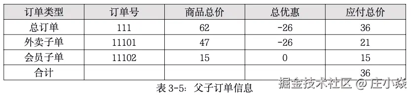 订单信息中美团红包是基于15元购买了优惠券以后才能使用的优惠,相当于这一单,用户要先买会员获得优惠券,然后在本单同时使用优惠券进行优惠,虽然是同一个订单,但我们可以想象出来,在交易处理层,至少需要做2次处理,一个是对美团会员的处理,另一个是对本单整单的优惠处理;所以订单需要拆成2个子单,一个是外卖单,一个是美团会员单,如表3-5所示: