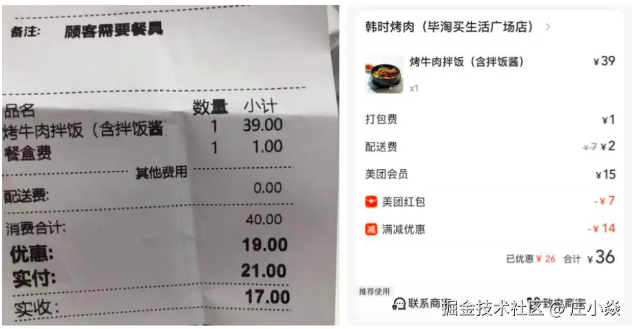 从一次美团外卖的小票入手进行分析,研究支付微观层面的业务流转、单据的生成等支付微观细节。看下面外卖盒上的小票,牛肉拌饭1份一共39元,餐盒费1元,没有配送费,合计40元,优惠了19元,实付21,实收17元;再看美团订单的信息,烤肉饭1分39元,打包费1元,配送费原价7元现价2元,美团会员15元;美团红包减7元,满减优惠14元;总优惠26元,合计36元,如图3-29所示: