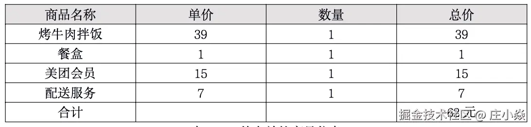 案例中的这单外卖的商品有4个(这里我们将配送服务看做商品),如表所示:
