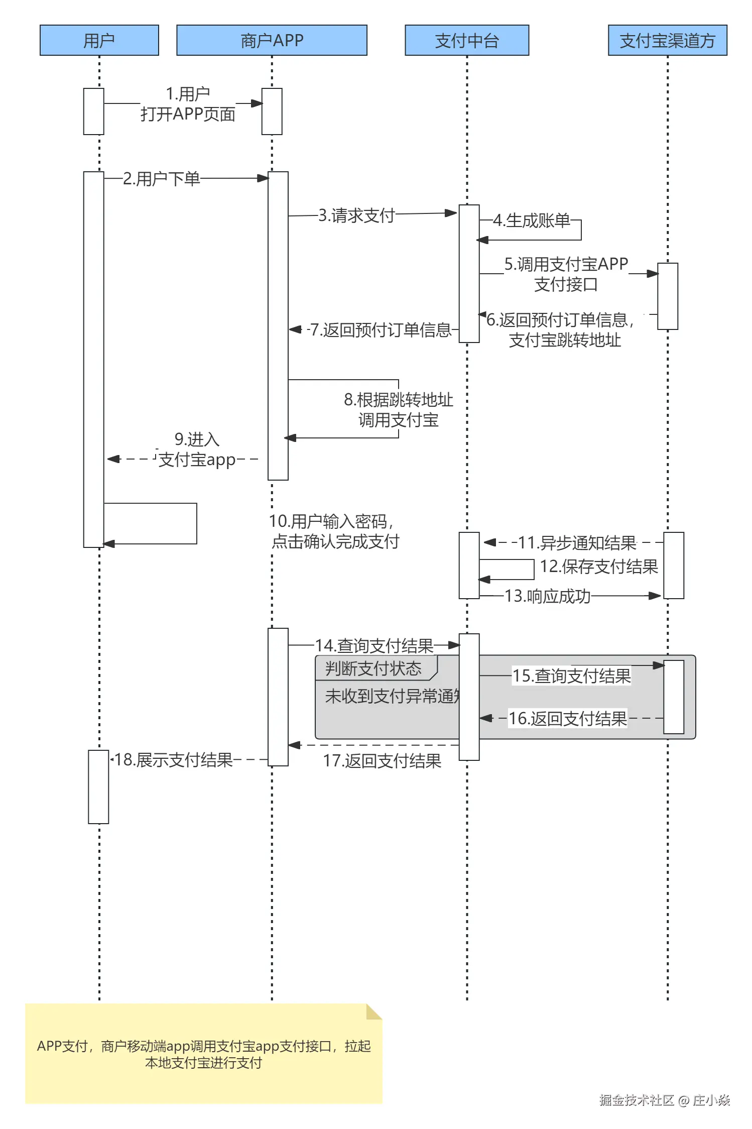 APP 支付,就是发生在商家APP内的支付。在商家APP内发起支付时,支付中台会请求上游支付通道,获取预支付信息。商家APP拿到支付预支付信息后,拉起本地第三方支付方式SDK(支付宝,微信等),最终在第三方应用内完成支付。