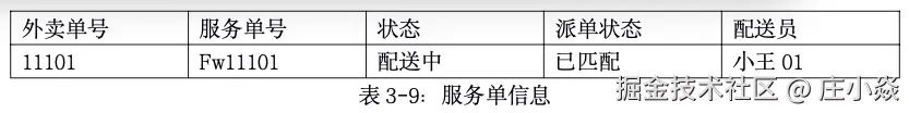 订单变为待配送时,会生成服务订单,也就是配送订单,由骑手小王01抢单了,这里的服务单信息如表所示: