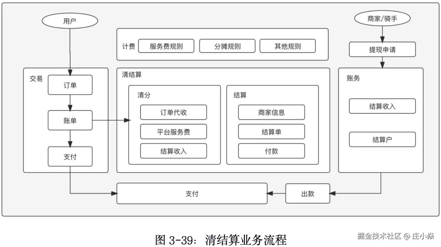 商家和骑手都可以在钱包里看到账户余额了,然后可以对余额发起提现;生成提现订单,请求打款中心完成出款,以上整个清结算的流程框架,可以简化成图: