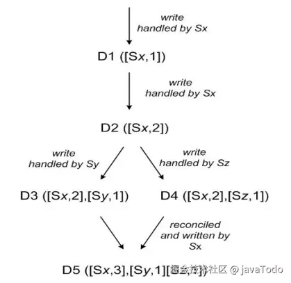 - 第5次更新时client端读取到D2、D3和D4 3个数据版本,通过类似Vector clock判断同时发生关系的方法可判断D3、D4存在数据冲突,最终通过一定方法解决数据冲突并写入D5