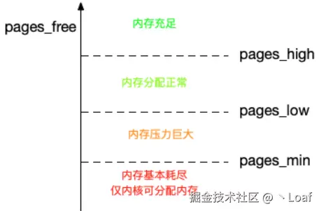 系统剩余的空闲内存用 pages_free 表示。当 pages_free 接近或低于这些阈值时,系统会启动相应的内存回收机制以缓解压力。