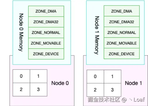 在 NUMA 架构下,多个处理器被划分到不同的 Node,每个 Node 拥有独立的本地内存空间。同一个 Node 内部的内存空间还可以进一步划分为多个内存域(Zone),如: