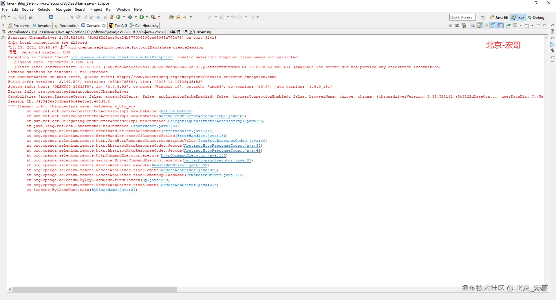 结果报错了(Exception in thread "main" org.openqa.selenium.InvalidSelectorException: invalid selector: Compound class names not permitted),控制台报错如下图所示: