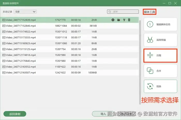步骤3:录制完毕后可以按照需求选择多种媒体工具进行编辑视频。如高级剪辑,可以快速分段视频、增加特效、重命名视频等。还可以点击“压缩”对视频文件进行压缩等操作。
