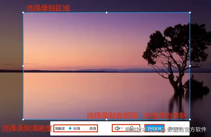 步骤2:按照个人需求选定录制区域,选择录制的音频源,录制清晰度等就可以点击“开始录制”了。