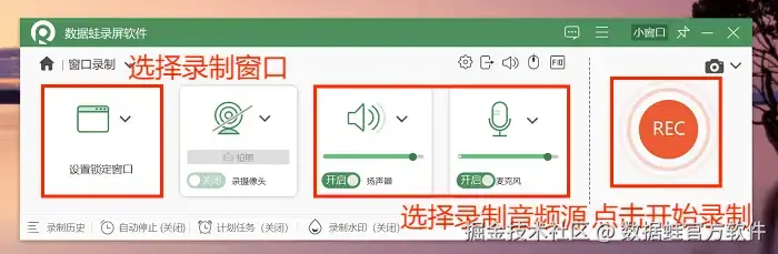 步骤2:可以自定义选择录制的窗口,还可以调整窗口中需要录制的范围。选择声音来源。通常包括“扬声器声音”和“麦克风声音”。调整完毕后就可以点击“REC”开始录制了。