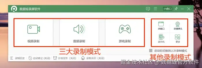 步骤1:下载并安装数据 蛙录屏软件,打开软件后你可以看到多种录制模式可以选择,按照需求选择就可以了,本文以“窗口录制”为例。