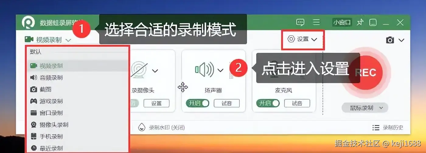 步骤1:在华为笔记本电脑上,打开该软件,首先点击左上角选择合适的录制模式。进入 【设置】 中调整视频录制的参数,如质量、格式、帧率等内容。