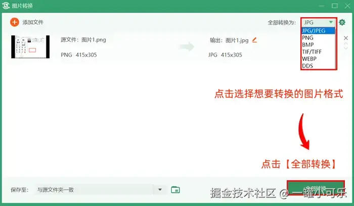 步骤3:点击图片转换界面的右上角处,点击选择想要转换的图片格式,然后点击【全部转换】即可。