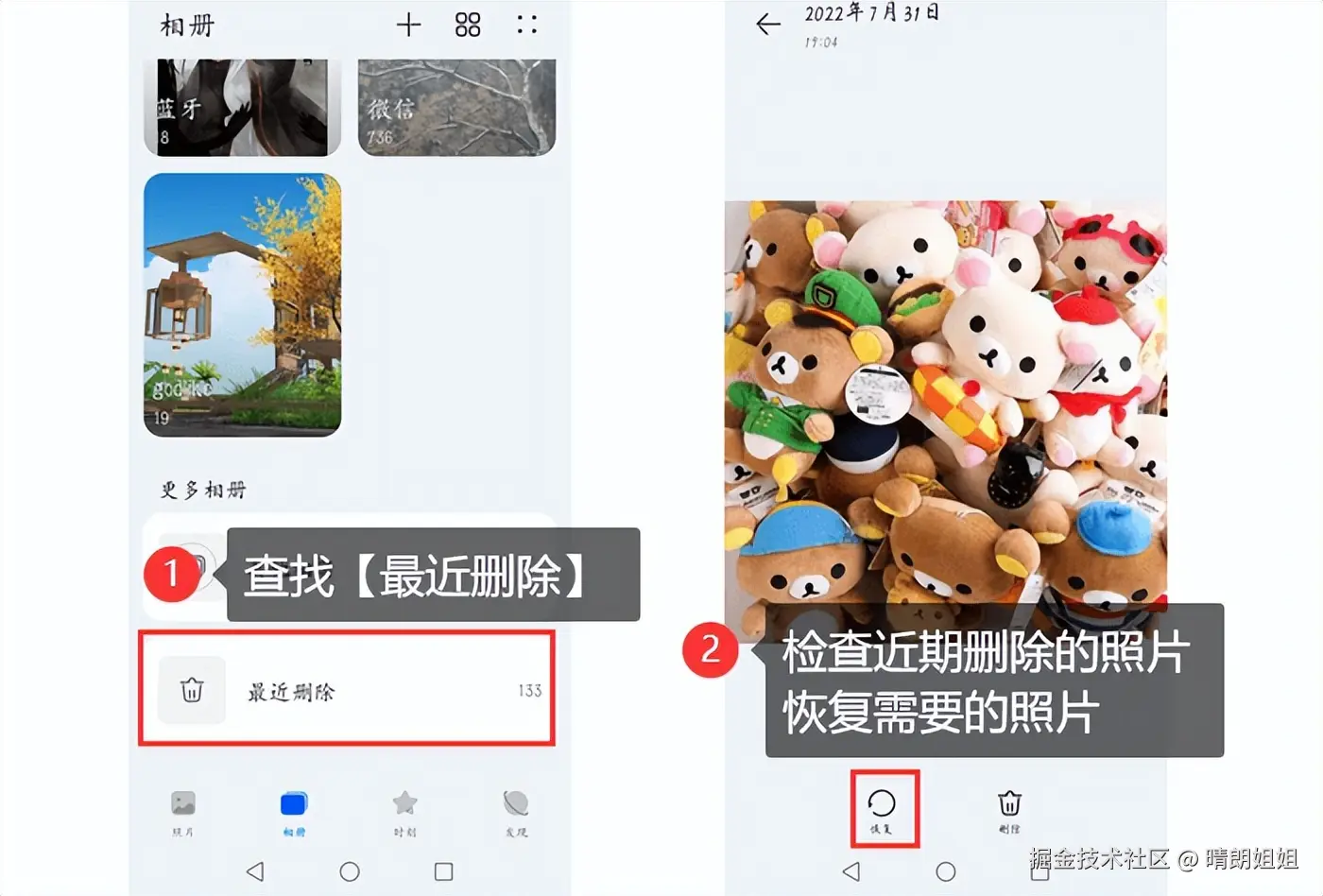 步骤:在相册界面中,通常会有一个 【最近删除】或【回收站】 的选项,点击进入。找到你想要恢复的照片,点击 【恢复】 按钮。
