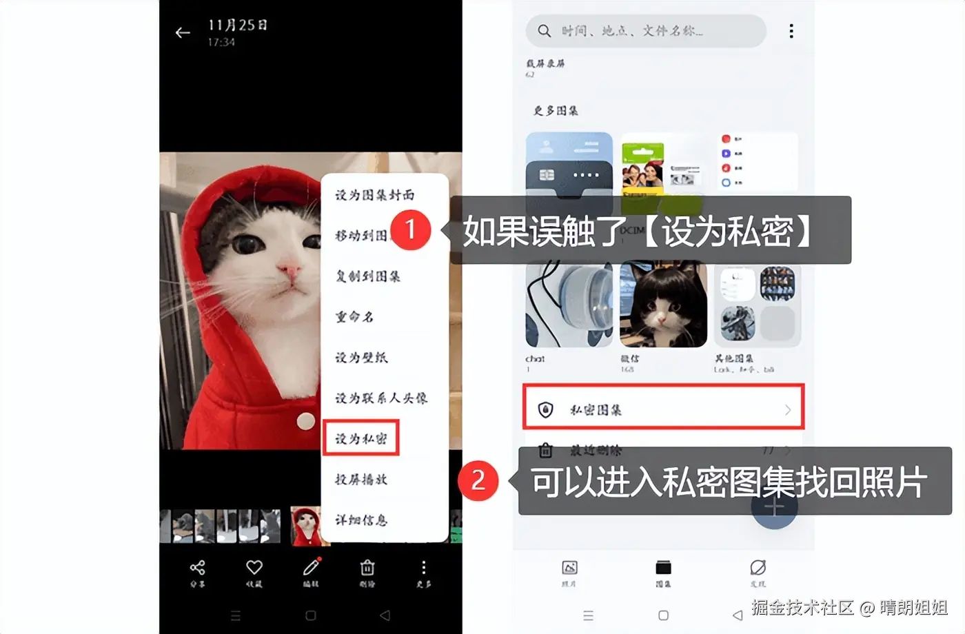 步骤:在相册中,找到 【私密图集】 或类似选项,输入密码后,查找照片,将其移出私密图集。