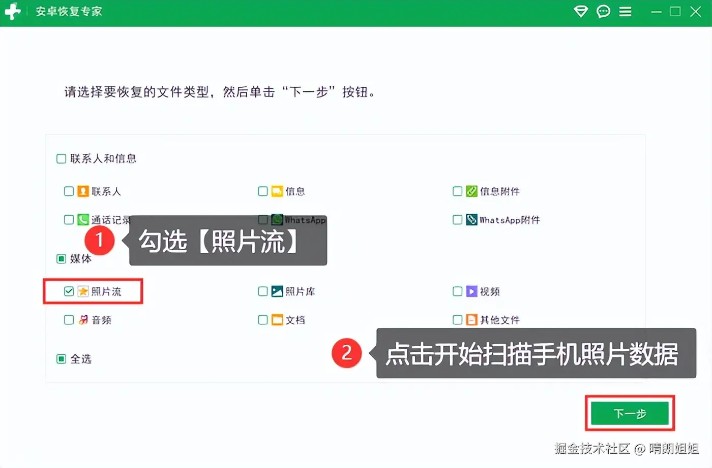 步骤2:连接成功后,软件会弹出需要恢复的文件类型选择页面,选择 【照片流】 然后点击 【下一步】 ,进行扫描吧!