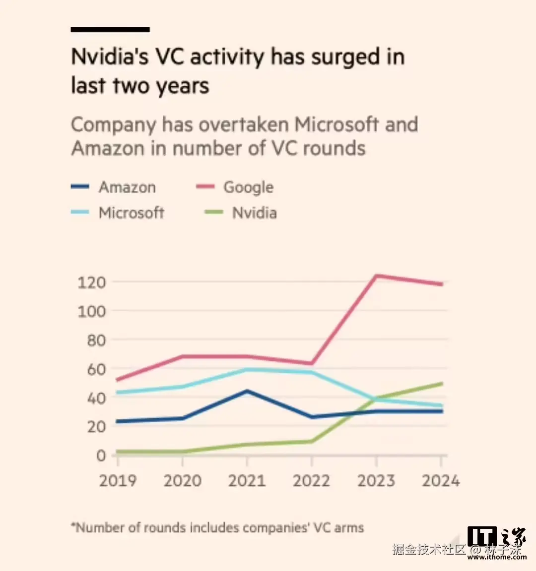 英伟达在 2024 年参与的融资次数,虽然比亚马逊和微软多,但不如谷歌公司,后者在 2024 年参与了 120 轮风险投资。