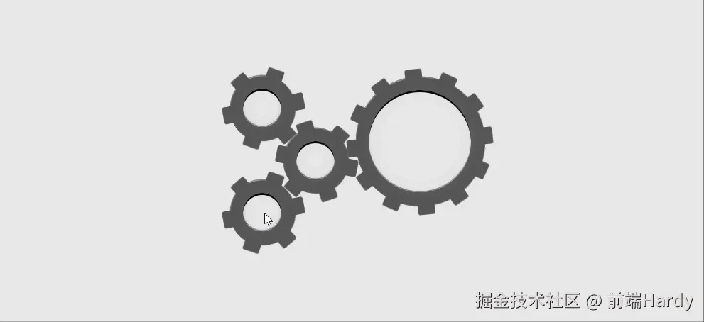 这段代码创建了一个包含四个齿轮的动画效果,每个齿轮以不同的速度和方向旋转,模拟了一个机械齿轮组的运作。