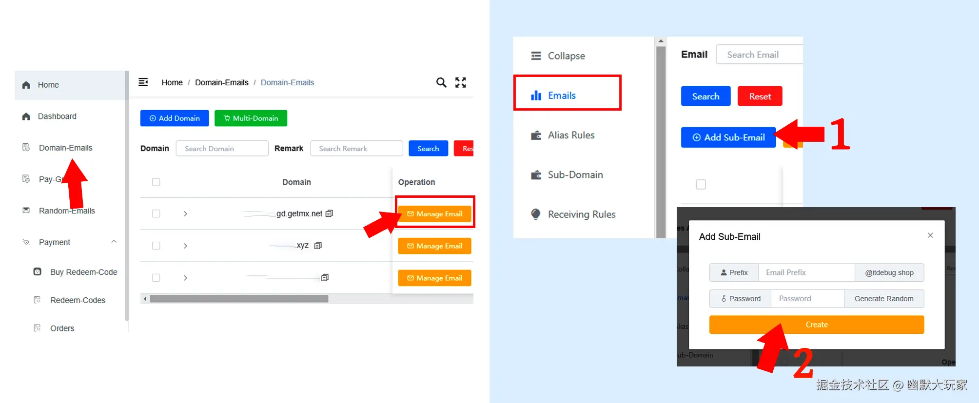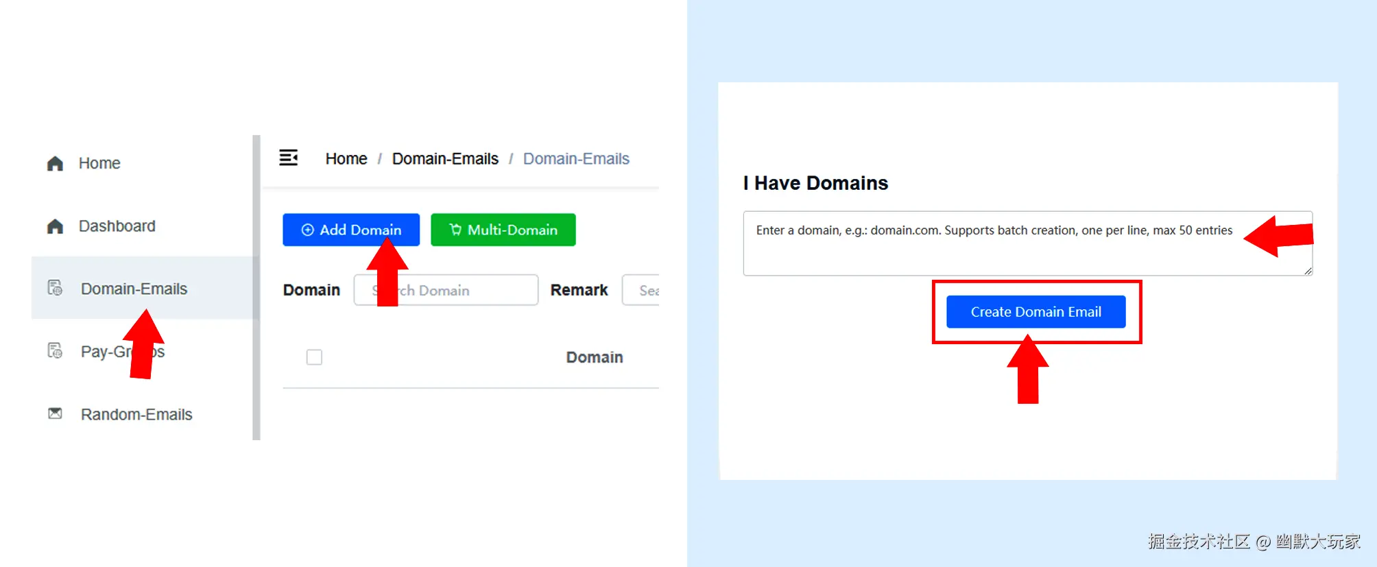 Domain-Emails > Add Domain > Selected Domain > Create Domain Email