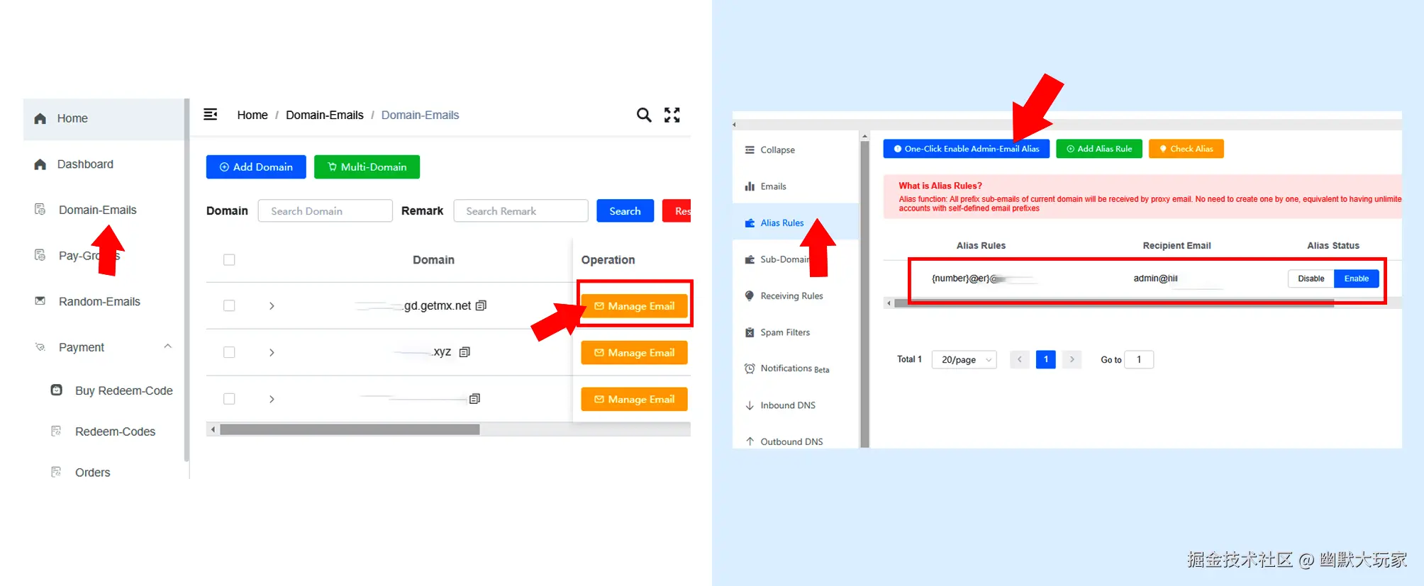Domain-Emails > Manage Email > Alias Rules > One Click Enable Admin-Email Alias