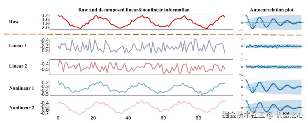 同时,观察 Fig2&3,我们可以看到线性模式更多关注序列的长期模式,而非线性更多关注短期浮动。另外,用于预测线性和非线性的权重,以及用于预测不同线性或者不同非线性的权重之间均存在差异。因此,高效地对这些线性和非线性模式进行分离,不仅可以帮助理解时间序列内部的特质,得到更具有解释性的预测结果,还能帮助我们设计更高效更鲁棒的预测算法。