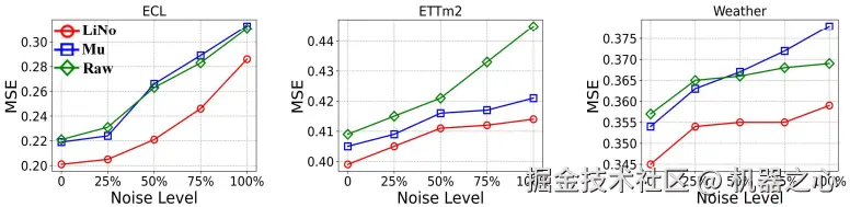 LiNO 框架在单变量时间序列预测领域的表现极为出色,其设计基于 iTransformer 这一领先业界的变换器模型作为基础架构。如表 3 所示,通过与'Raw'(传统设计)和'Mu'(N-BEATS 中使用的递归表示分裂预测设计)的比较,LiNO 在 ETTm2、ECL 和 Weather 数据集上实现了 2.96%、6.34% 和 6.72% 的 MSE 降低,这一成就凸显了其在有效分离和处理线性与非线性模式方面的高效率。此外,LiNO 在面临不同噪声水平的挑战时,依然展现出了卓越的鲁棒性和可靠性,如图 5 所示,这不仅验证了其设计的稳健性,也进一步证实了在时间序列预测模型中区分线性与非线性模式对于提升预测鲁棒性的重要性。