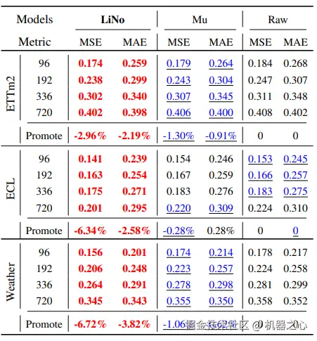 表 3 LiNo 框架对 iTransformer Backbone 的预测精度提升