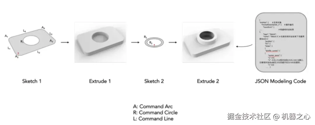 计算机辅助设计(CAD)已经成为许多行业设计、绘图和建模的标准方法。如今,几乎每一个制造出来的物体都是从参数化 CAD 建模开始的。CAD 构造序列是 CAD 模型表示的一种类型,不同于 Mesh 类型的三角网格、B-rep 格式的点、线、面表示,它被描述为一系列建模操作,包括确定草图 3D 起点和 3D 草图平面方向、绘制 2D 草图、将草图拉伸成 3D 实体形状的完整参数和过程,以 JSON 代码格式储存和表示。这类表示方法与专业建模工程师构建 CAD 模型的过程最为近似,可以直接被导入 AutoDesk、 ProE 等建模软件。构建这些 CAD 模型需要领域专业知识和空间推理能力,也需要较高的学习成本。