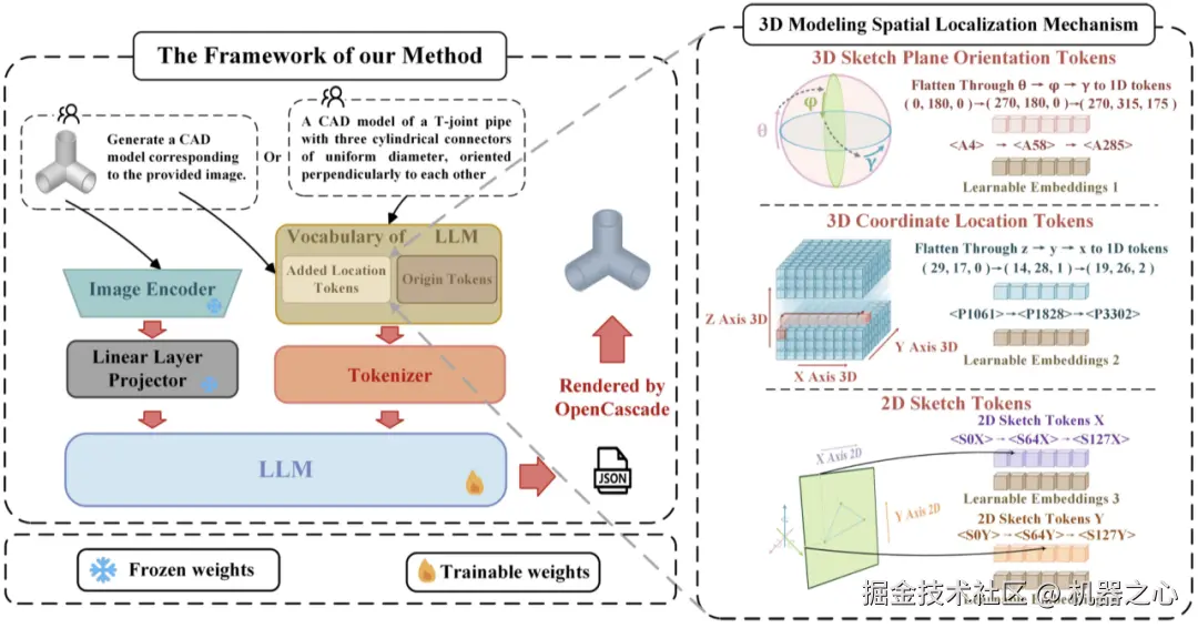 我们把关键的 3D、2D 建模参数定义为大语言模型可以理解的建模语言,便于大模型理解和生成。具体来说,设计了 3 个系列的定位 token 来代替 3D 草图平面起点坐标、3D 草图平面角度和 2D 草图曲线坐标的参数。通过将全局空间 3D 坐标、草图平面 3D 旋转角度的特征展开到一维语言特征空间,将它们转换为两类不同的 1D 位置 tokens。此外,2D 草图被离散化并转换为特殊的 2D token。这些 token 被合并到原始 LLM 词表中。同时,纳入了 3 类适配 3 种 token 的自定义可学习的位置嵌入,以弥合语言和空间位置之间的差距。