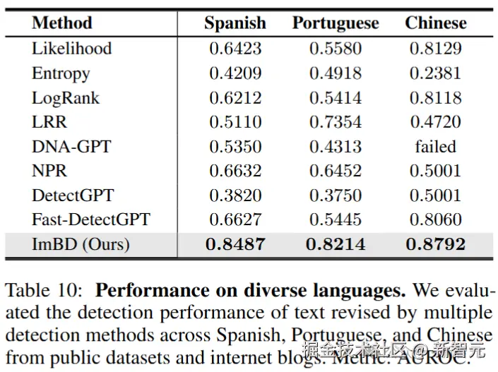 ImBD 在多语言文本检测中展示出优异的泛化能力,在西班牙语、葡萄牙语和中文的检测中分别达到 0.8487、0.8214 和 0.8792 的 AUROC 分数,全面超越 Fast-DetectGPT 等基线方法,且在部分基线方法(如 DNA-GPT [9] )失效的中文测试中仍保持稳定性能。