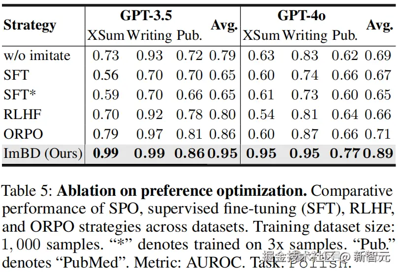 与未使用模仿策略的基线模型相比,采用 SPO 优化的 ImBD 方法在 GPT-3.5 和 GPT-4o 的文本检测上 AUROC 分别提升了 16% 和 20%;相比使用 3 倍训练数据的 SFT(Supervised Fine-Tuning)方法,ImBD 的 AUROC 在 GPT-3.5 和 GPT-4o 上分别高出 30% 和 24%。