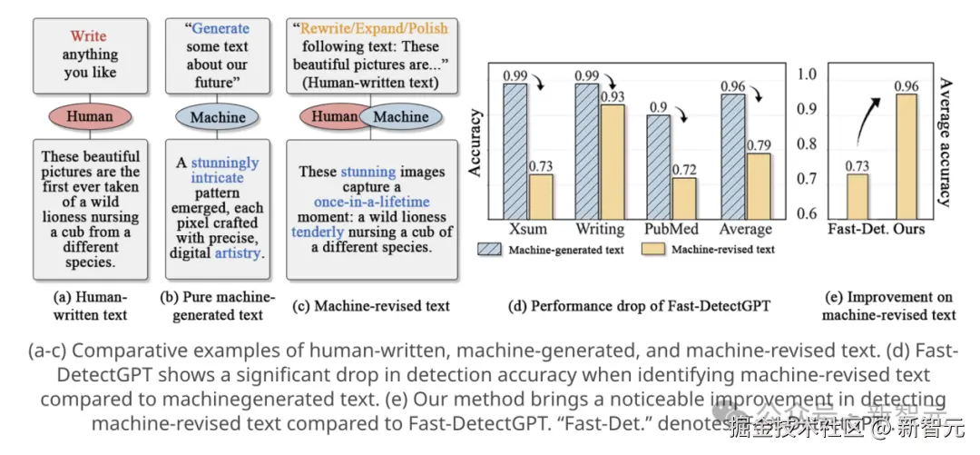 如图 1(d) 所示,在检测机器修订文本时,即使是最先进的 Fast-DetectGPT [1] 方法也出现了明显的性能下降。