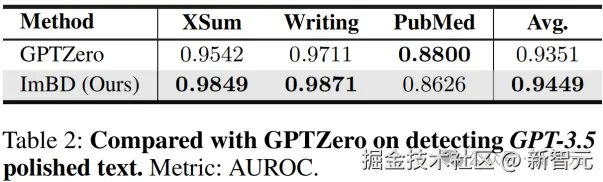 仅使用 1000 个样本和 5 分钟的 SPO 训练,ImBD 就达到 0.9449 的 AUROC 分数,超过了使用大规模数据训练的商业检测工具 GPTZero [4] (0.9351)。