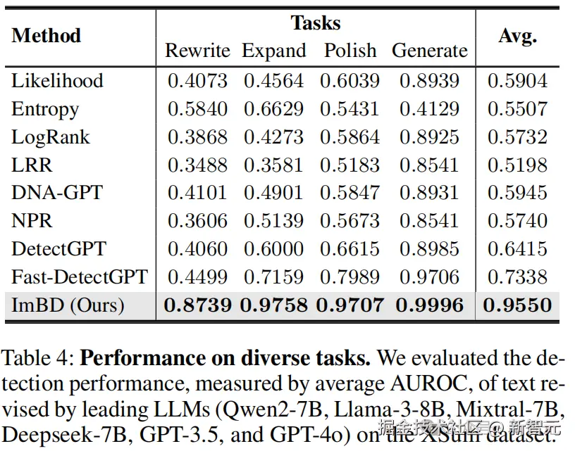 ImBD 方法在 rewrite(0.8739)、expand(0.9758)、polish(0.9707)和 generate(0.9996)四个任务上全面超越现有方法, 平均性能比 Fast-DetectGPT 提升 22.12%,证明了其在不同任务和用户指令下的稳健性。