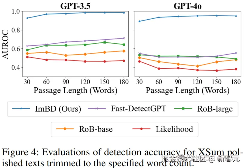 当文本长度从 30 词增加到 180 词时,ImBD 方法始终保持领先优势,且随着文本长度增加检测准确率稳步提升,展现出卓越的长文本处理能力。