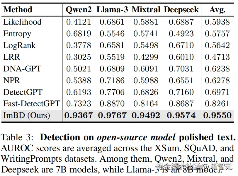 在检测 Qwen2-7B [5] 、Llama-3 [6] 、Mixtral-7B [7] 和 Deepseek-7B [8] 四个开源模型修改的文本时,ImBD 方法在 XSum、SQuAD 和 WritingPrompts 三个数据集上的平均 AUROC 达到 0.9550,显著优于 Fast-DetectGPT 的 0.8261。
