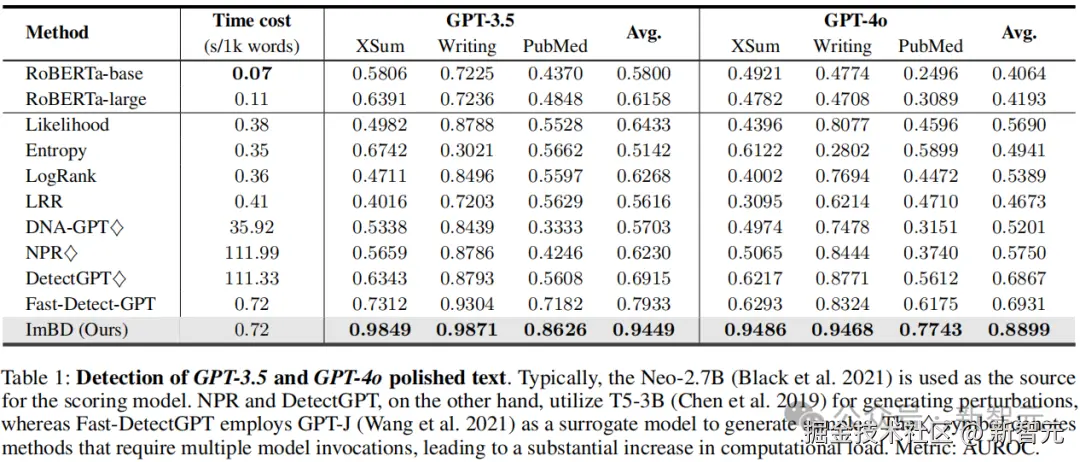 在 polish 任务上,相比 Fast-DetectGPT,ImBD 在检测 GPT-3.5 [2] 和 GPT-4o [3] 修订的文本时分别提升了 15.16% 和 19.68% 的性能;相比有监督模型 RoBERTa-large,ImBD 在 GPT-3.5 和 GPT-4o 的文本检测上分别提高了 32.91% 和 47.06% 的性能。在保持高检测性能的同时, 推理速度仍保持高效, 每 1000 词仅需 0.72 秒。