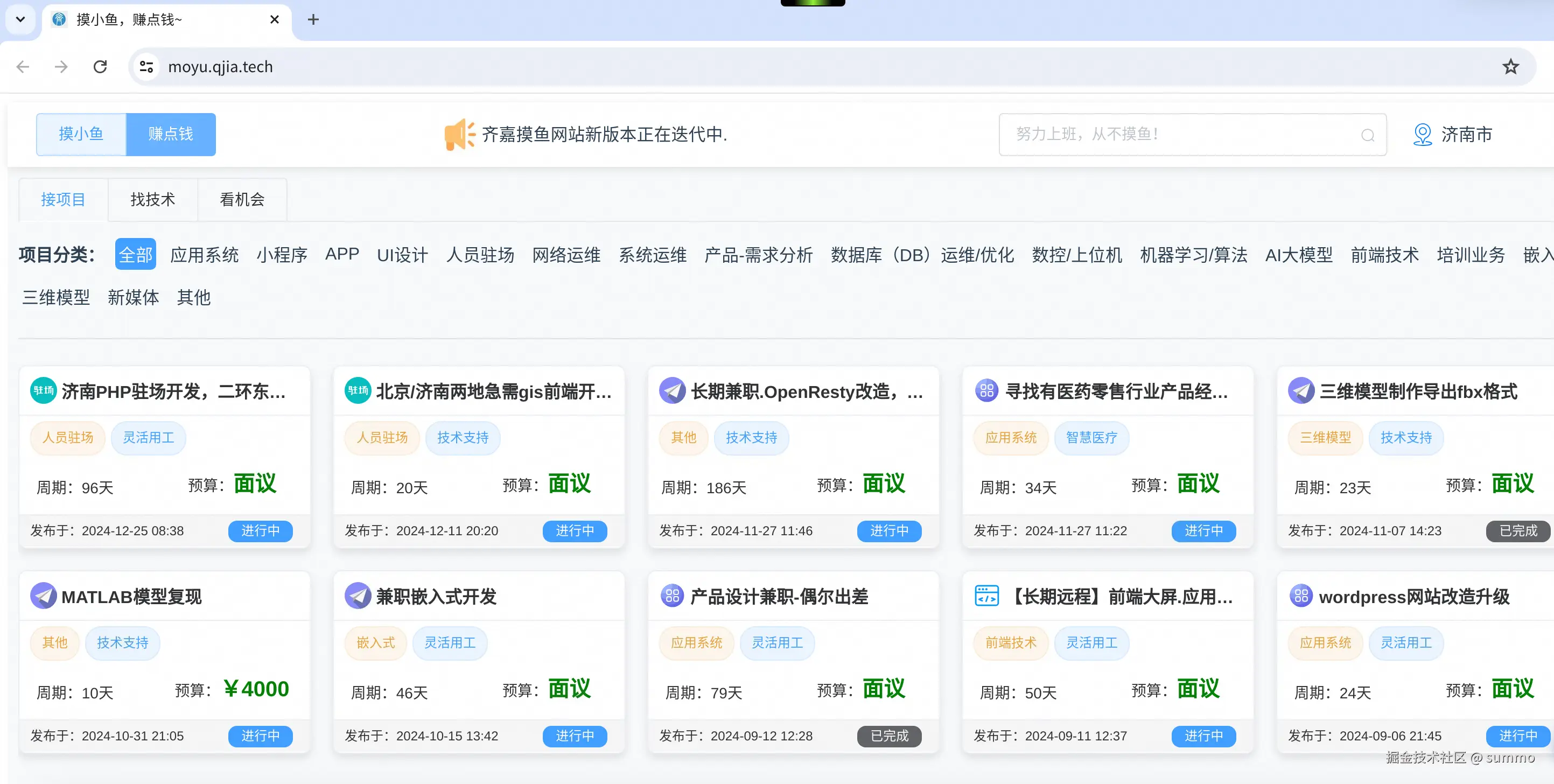 其次就是小网站的二创,是的,你没有听错,就这么个小网站还能有二创!有位老板看到了小网站之后联系我,说他有一个程序员接单的小程序,但是没有PC端网站,想把他的兼职信息放到小网站上。后来他给我画了一些原型稿,让我自由发挥,做完后的效果是这样的,访问链接是这个:moyu.qjia.tech