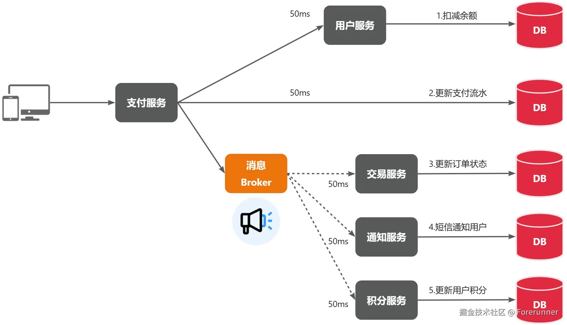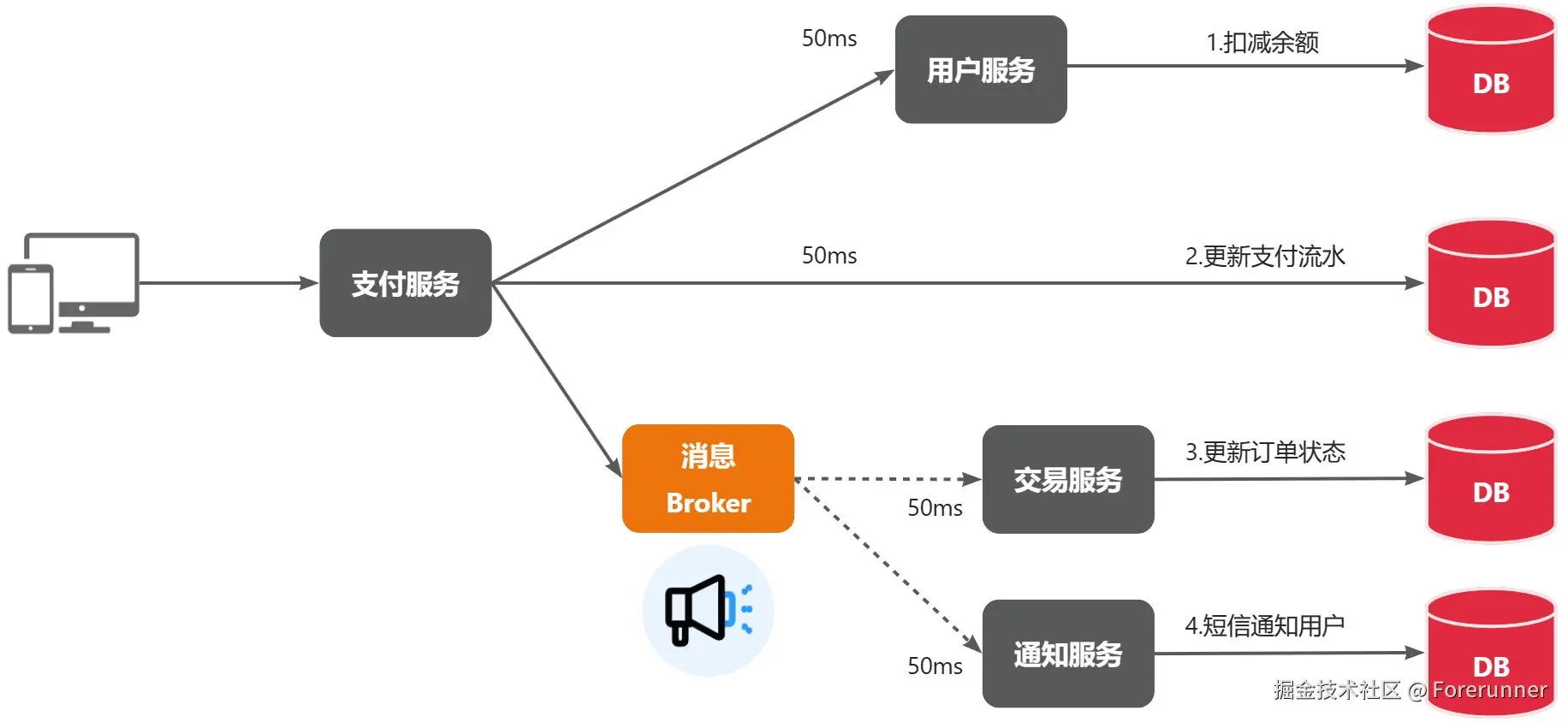 不管后期增加了多少消息订阅者,作为支付服务来讲,执行问扣减余额、更新支付流水状态后,发送消息即可。业务耗时仅仅是这三部分业务耗时,仅仅100ms,大大提高了业务性能。