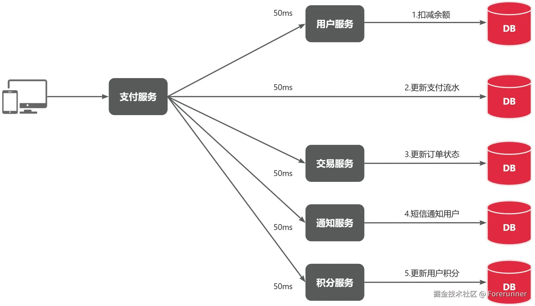 假如每个微服务的执行时长都是50ms,则最终整个业务的耗时可能高达300ms,性能太差了。