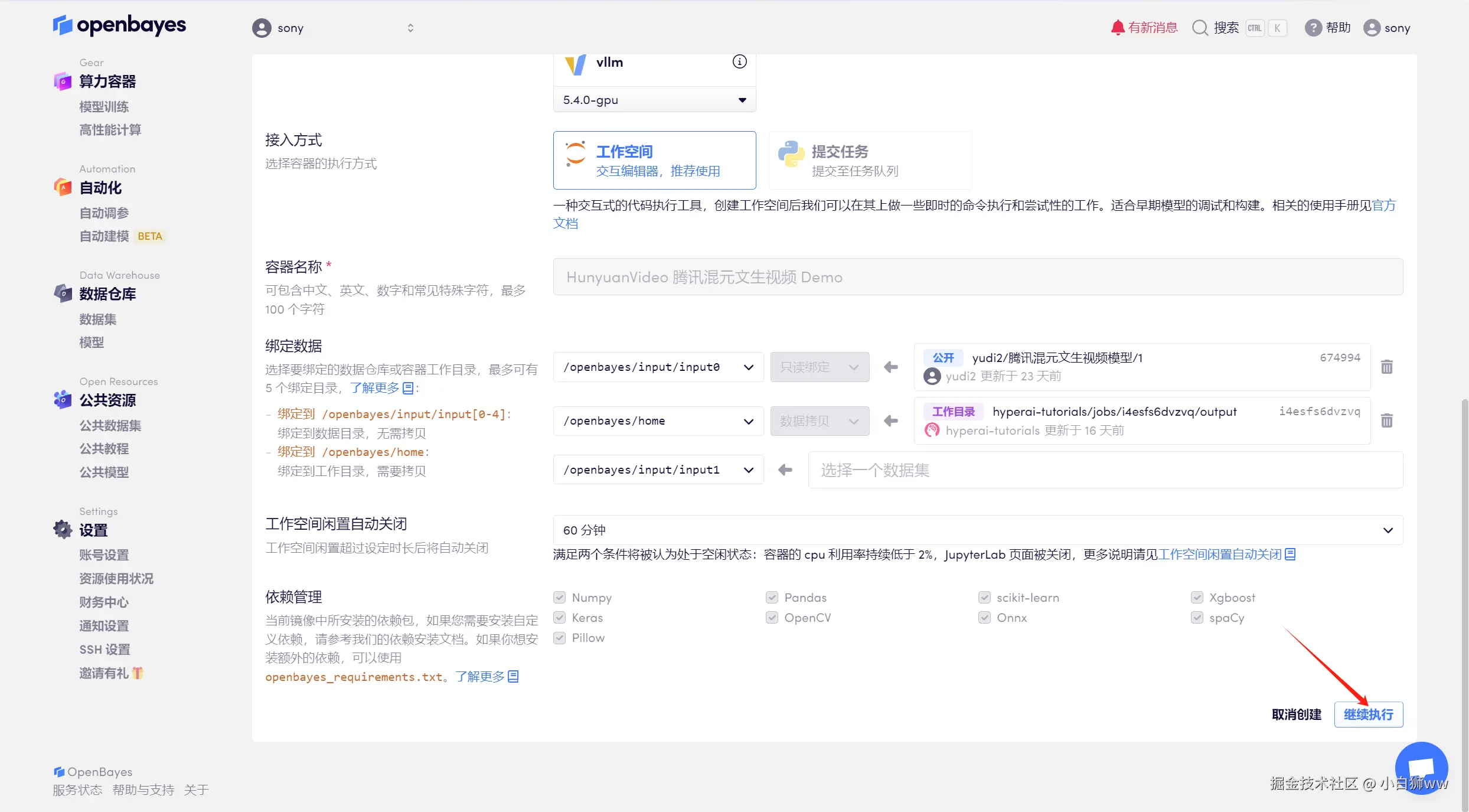 选择「NVIDIA A100」以及「PyTorch」镜像,OpenBayes 平台上线了新的计费方式,大家可以按照需求选择「按量付费」或「包日/周/月」,点击「继续执行」。可以使用文章开头的邀请链接,获得 RTX 4090 使用时长!